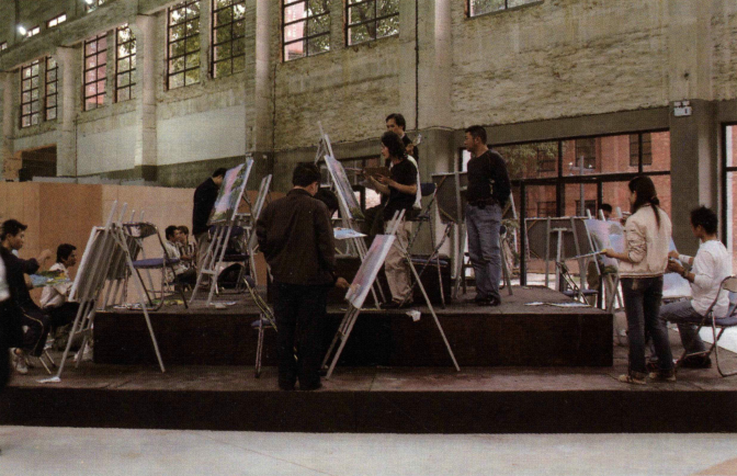 On November 17, 2005, thirteen young men and women arrived in Guangzhou from Dafen oil painting village located about 90 kilometers away near the city of Shenzhen. They had been hired by the young artist Liu Ding to “perform” their day jobs, making oil paintings throughout the opening of the 2nd Guangzhou Triennial. On a three-tiered triangular platform, the painters were arranged according to skill level and task; the majority of them were stationed on the bottom tier, and the smallest of the three groups was stationed on top.