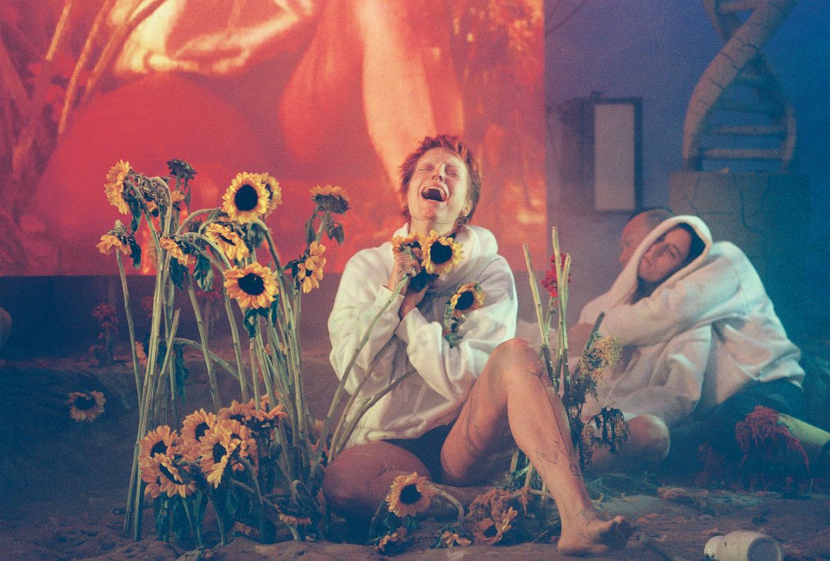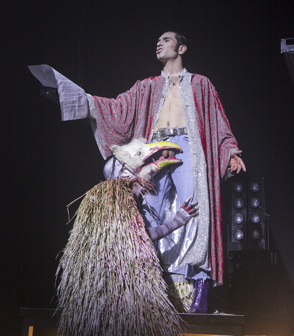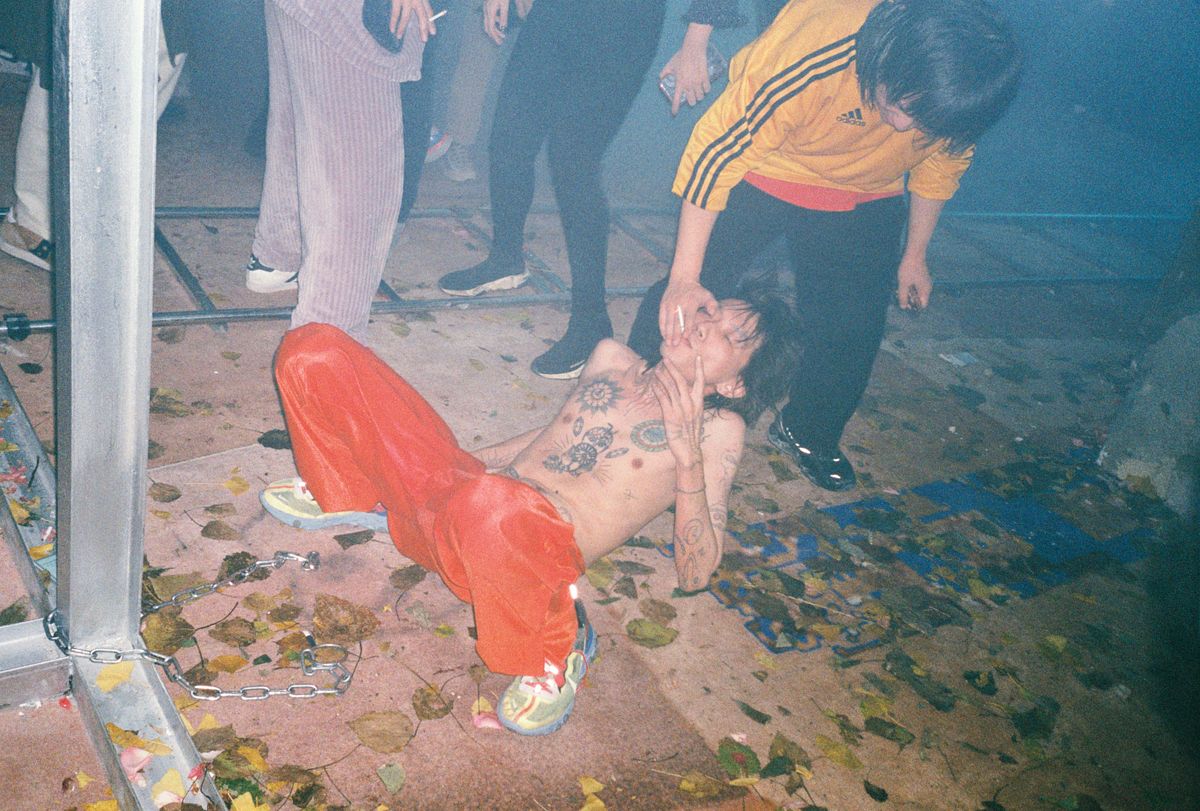 Seeming to come from underground, the beats grow, expand, envelop you while you explore the space. Through the purple smoke, you discover the peculiar figures that are scattered around: sitting, washing, sewing, awakening, coming back to life… There is neither a seat nor a single distinct stage prepared for you. What’s left is only the space in-between: a space in constant flux, unidentifiable; a string space that connects you and the figures you see through the purple smoke when your “role” as a “passive spectator” was not even given as an option. Then after a while, when one of the figures lying on the bar table — the “drag Cheshire cat,” known as the evil wife (played by baby ChinaYu) later in the performance — looks straight into your eyes with a seductive, sleepy wink, thinking, observing, then offering you a glass of Bier vom Fass, you may, perhaps, start to wonder, am I becoming one of them… An invitation, specifically addressed to you, “to become one of them” is the secret code to enter the dithyrambic SF of Chen Tianzhuo.