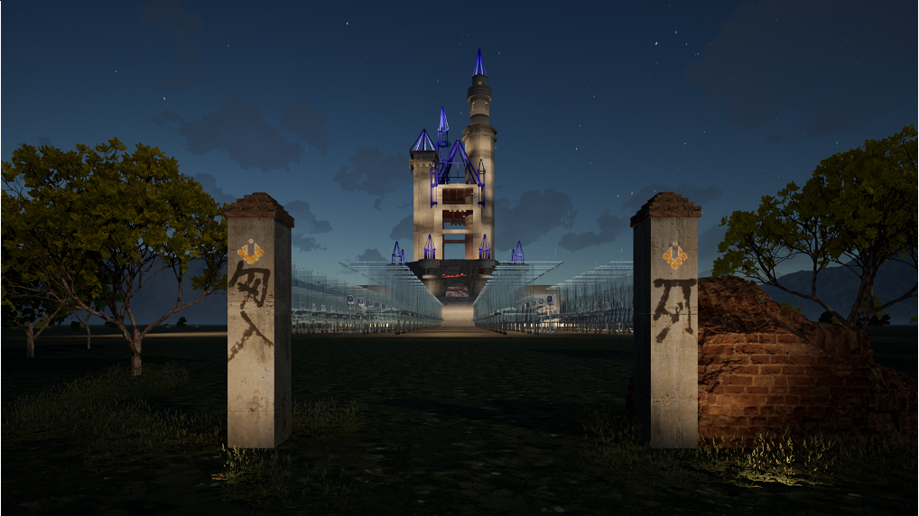 Beyond two entry columns hovers the industrial skeleton of a castle, illuminated from below and set against a just-after-sunset sky dotted with stars. Turn around, and you’ll see a full moon looming above the stretch of distant mountains. Crickets chirp relentlessly, suggestive of warm weather, yet there’s something unsettling here that chills the atmosphere. These are the sprawling grounds of Wonderland, an unfinished and abandoned amusement park on the outskirts of Beijing, that was demolished several years ago—now resurrected in virtual space. Borrowing its title from this original site, Wonderland is an online group exhibition at EPOCH, an artist-run virtual experiment by Peter Wu+ that I find myself traversing in from the mobile interface. Opening during times of surging anti-Asian sentiment, racial tensions, and global pandemic, Wonderland brings together the work of ten Chinese diasporic artists based in the United States. Each, in varying degrees, further flips or rejects stereotypes and tokenization around what it means to be a Chinese American artist.
