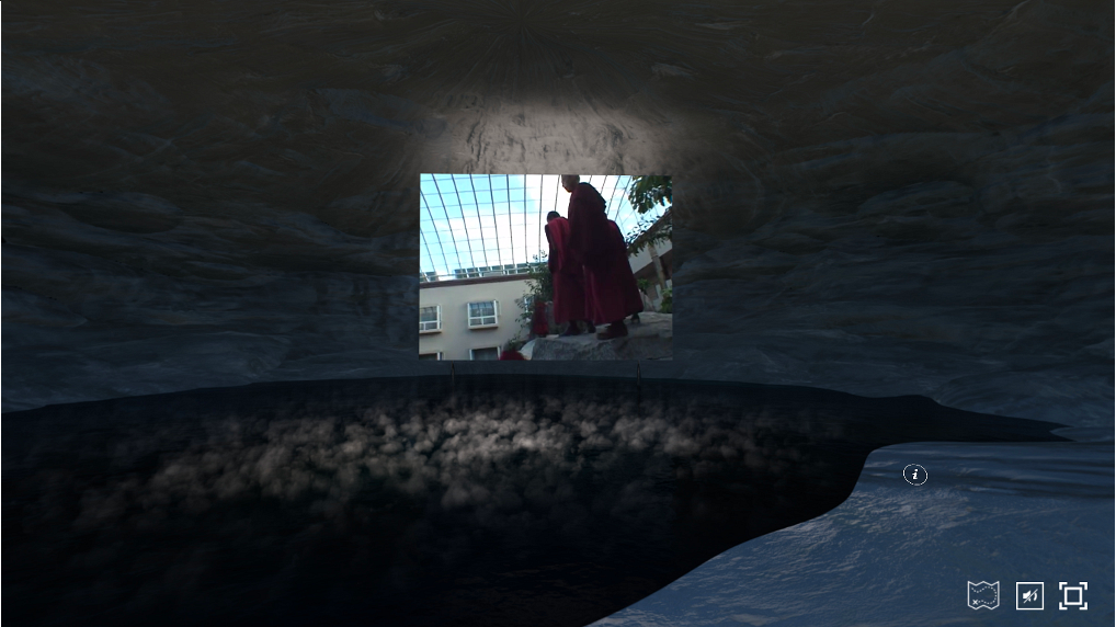 Just beyond the castle entrance is Shangri-La (2005) by Patty Chang, a video floating inside of what appears to be a rock cavern containing a cloud-filled lake. On the platform up are three oil paintings by Dominique Fung, who exploits Western canonical styles to depict various real Chinese porcelains; each merges narratives, worlds, and even prosthetics through their own agency. The themes of both artists—the tourist town Shangri-La first mythologized in James Hilton's novel Lost Horizon (1933), and the porcelains— reveal the enduring assumptions that underlie processes of colonial aesthetic subjectification and objectification. The virtual context of the Wonderland ruins here, functions in a similar way. Images of the original Wonderland’s haunting, half-built, medieval architecture have long been circulated online, particularly by Western media as indicative of the Asian financial crisis, economic failure, and layers of orientalist fantasy.