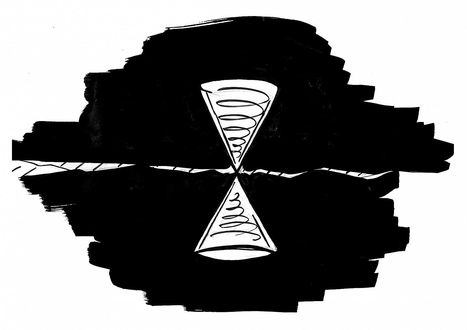 This hourglass-shaped building in the desert can accommodate 170,000 people at a time. Its two cones, sitting above and below the ground, are the same volume. The façade of the building absorbs and refracts sunlight at will, making it convenient for natural mimicry. When we discovered this building, it had been completely concealed by the desert. Needless to say, it has a highly discreet entrance. Upon entering the cone, one is confronted by a row of clocks hanging on the wall behind the front desk, each presenting a different time. Every clock has its own system for calculating time, implying that, once inside this building, one must abandon the customary concept of time. In similar fashion, the lighting design of the building does not follow the laws of the sun.