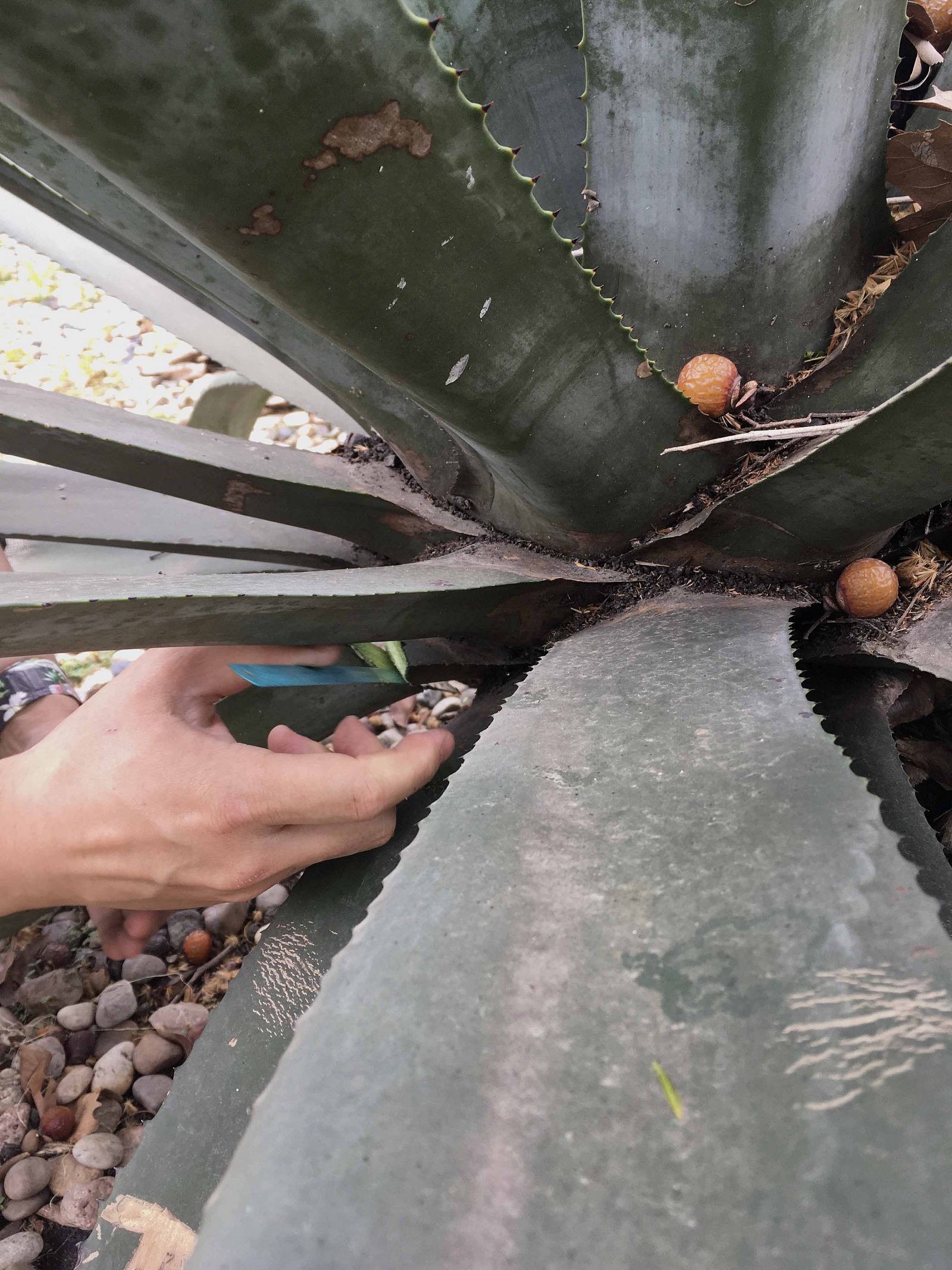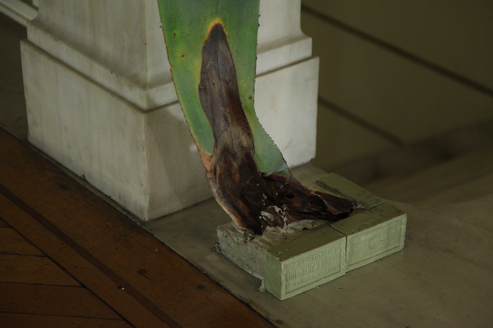 I‘m captivated by the interplay of fixity and motion, and I throw myself into any kind of athletic exercise. Again and again I reenact the movements of lifting and carrying: carrying plants, carrying stones, carrying rubbish, carrying an unfinished “black egg,” carrying a “leg” wrapped in bubble wrap. I climb from the hilltop back to the city, climb from the base of the hill to the valley, climb from one end of the exhibition hall to the other; I try out the exaggerated poses of relief sculptures, the warm-up poses of my core training routine, the awkward poses of a beginner. With a razor blade I carve olive soap into a polyhedron, and set it in the knee of the clay statue; I knead the soap and a lump of cement together to provide a pedestal for the coiled agave leaves. I mix the sulfur soap and cement and spread it into the shape of a stone. I carefully wrap the agave leaves and place them in a plastic bag. Ji’er reaches out for the bag. The child has been watching me work for over an hour. I lean in to get at the root of the agave plant, and as I work the saw, the leaf twitches up and down, swaying rhythmically. Soon my arm is covered in scratches from the spines.