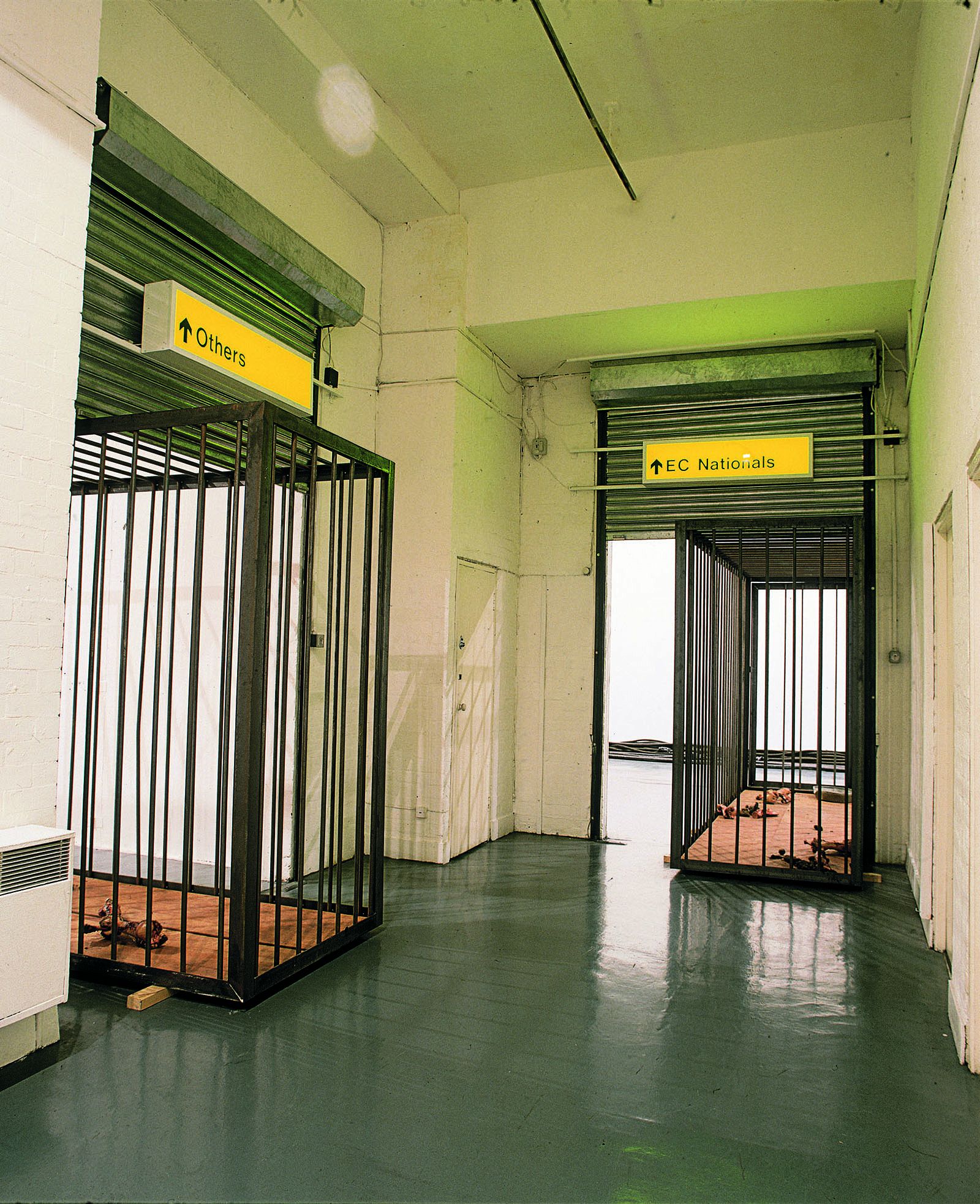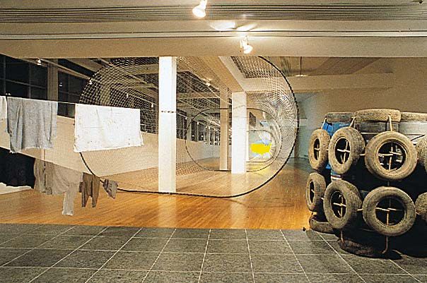 Even as Huang unearths the historical origins of these myths, his demystification strategy does not depart from his current reality; his true intention is to focus on reality. The Marseille exhibition of Three Steps, Nine Footprints was not without a basis in reality. Most of last year’s terror attacks took place in Paris, but the direct reason for Huang’s choice may have been the hijacking of an Air France flight by GIA on Christmas 1994, which ended at Marseille airport. The city of Marseille is located on the Mediterranean coast, so it has always been a base of operations for French colonial endeavors. The city is a mixture of races, religions, and cultures. It has frequent contact with the former Algerian colony, and today it is a typical post-colonial city. Marseille is an important link in the relationship between France and Algeria. For more than six months, symbolic images of government counterterrorism efforts, such as police patrols, inspections, closures, and garbage cans, have been part of everyday life in Marseille. In this context, Huang’s work gets right to the point, showing the city’s more universal yet multi-faceted significance. This focus on the present and its political mythologies have been an important part of his recent work in Western contexts, as demonstrated by Passage (1993) at the Glasgow Gallery of Modern Arts, Human-Snake Plan (1993) at the Wexner Centre, Chinese Hand Laundry (1994) at the New Museum, and Kearny Street (1994) at Capp Street Project. Three Steps, Nine Footprints in Marseille more successfully fuses the past and present, thereby giving his demystification strategy more depth.