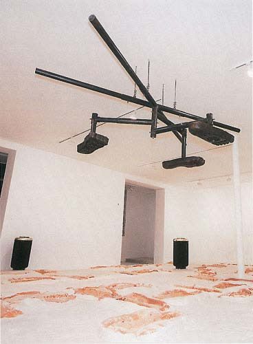 Barthes wrote, “Truth to tell, the best weapon against myth is perhaps to mythify it in its turn, and to produce an artificial myth: and this reconstituted myth will in fact be a mythology. Since myth robs language of something, why not rob myth?”3Barthes, 135. Huang Yong Ping fully understood this strategy, so he stole an allusion to myth from Chinese history that seems unrelated to Western reality: the Steps of Yu or the idea of “three steps, nine footprints.” When he uses this idea to resist the myths of terrorism and counterterrorism, it invades the territory of Western myth. He layers one myth on top of another, dissolving it and re-mystifying it to achieve demystification. In these specific circumstances, terrorism can be an expression of suppressed voices, and discourses from other cultures like the Steps of Yu—which have mythical qualities—can give voice to an alternative culture in this “civilized” society. Here, Huang is juxtaposing different alternative and mainstream discourses, such that they collide with and resist one another, then dissolve one another. The myths of terrorism and counterterrorism are built on what Barthes characterizes as a reduction in its historical essence, which makes it empty, rational, and natural. The invasion of alternative discourse attacks and destroys this rational order, creating the chaos of the mingled footprints of men and gods, the coexistence and conflict between different religions and cultures, and the intersection of colonial history and post-colonialist reality, which Huang Yong Ping emphasizes with his three feet that walk together. This chaotic situation is the beginning of the complete deconstruction of these myths.