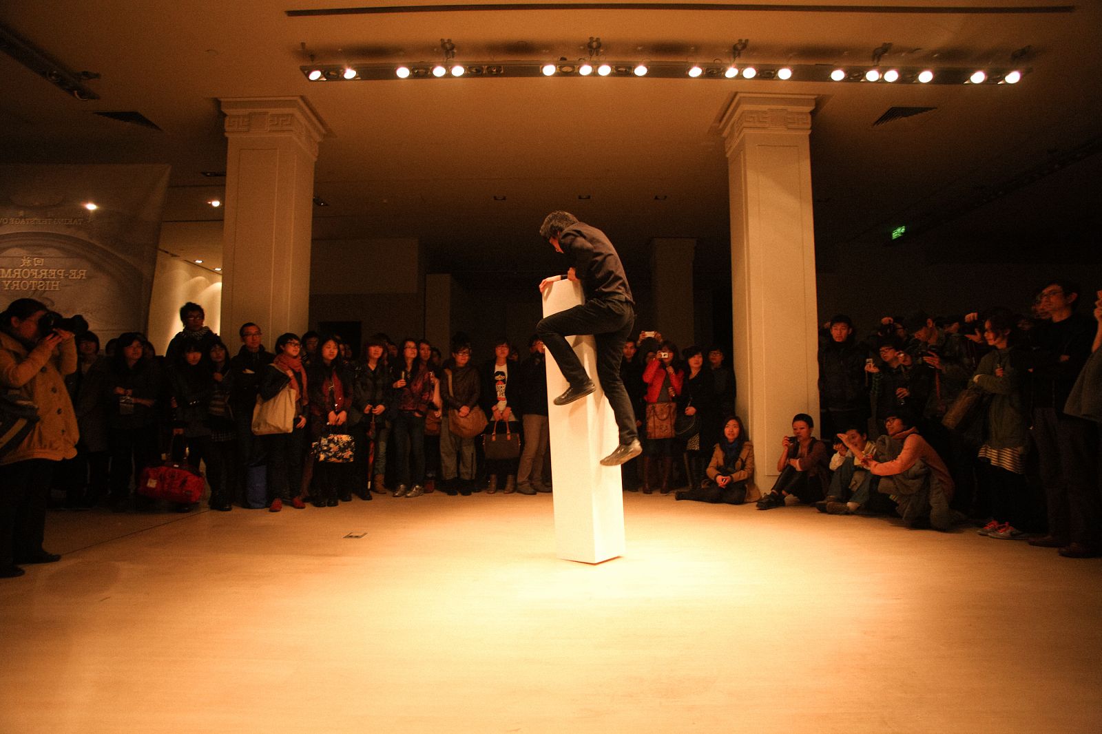 陆平原回访了这位早逝艺术家的行动,但将原先只有60厘米的木质台座改成他自己的身高和体重差不多的尺寸。而正是这则改动,让实际的表演变得跟原作截然不同。在现场表演中,他自己的身高成了某种超克展台的阻碍。长达8分钟的表演过程,主要是他屡次失败的登顶尝试。展台时不时应声倒地。这当然是平时看展览时不可能出现的场景。但更戏剧性的是,它发出的巨响反而紧抓现场观众的情绪。每当陆平原手扶着台座休息时,台座往往看起来更像是艺术家自己的分身,有种拟人化的感觉。在陆平原终于登顶后,观众也报以热烈鼓掌。