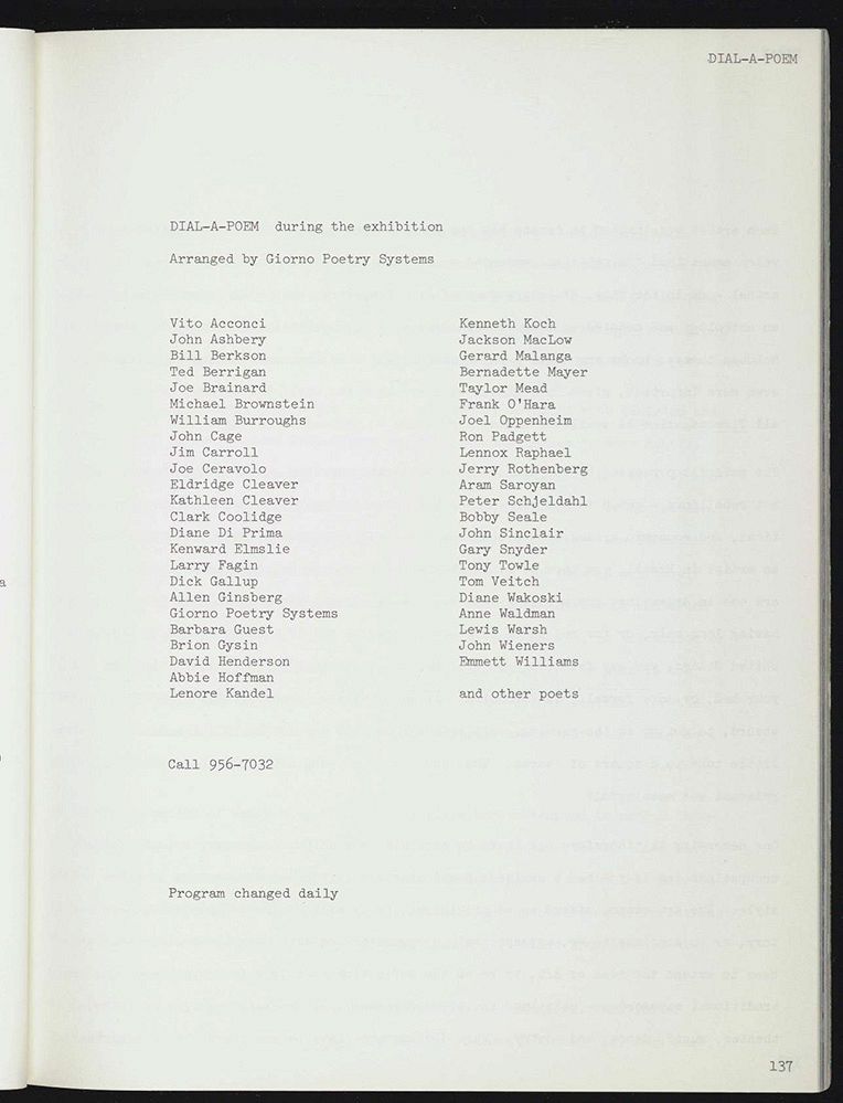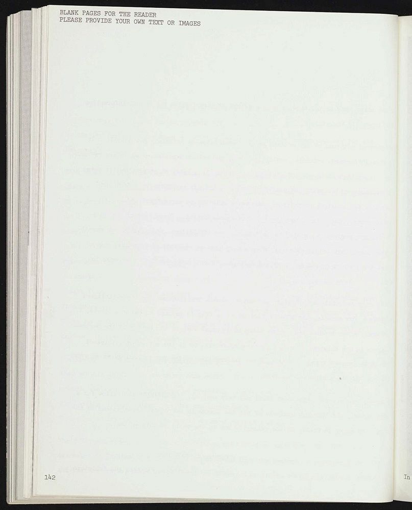 在五十年前的纽约夏天,展览“信息”只维持了短暂的两个月。相比之下,《信息》一书却创建了一个对观念主义的主张和思考而言都极具启示性的移动场所。在当时,每一位参展艺术家或艺术团体都获得了出版物中一块尺寸固定的空白区域(美国信纸大小的文书用纸)进行自由创作。因此,用一页或最多几张跨页来创作“特定场域”(site-specific)的作品就此诞生。6麦克希恩在其策展文章中首先声明以下内容:“每位艺术家均受邀为这本书做出自己的贡献,这种情况意味着所呈现的材料将直接与展览中的实际作品相关,也可以与展览中的作品无关。因此,这本书实质上是选集,可被认为是展览的必要辅助。”参见论文《信息》,1970年。另外,也请参阅权美媛(Miwon Kwon)的《一个又一个地方:特定场域的艺术和区域性的身份认同》。自1960年代以来,“特定场域”一词经历了不同的历史转折。正如权美媛所说,这个词现在“分散在更广泛的文化、社会和话语领域,并且通过艺术家的游牧行动相互关联地组织起来——这种运作更像是一份行程单而不是一张地图——而现在,场域可以是像广告牌、艺术流派、被剥夺权利的社区、机构框架、杂志页面、社会事业或政治辩论那样多样。”参见该书的简介,第3页。 《信息》的编辑与丰富多样的视觉形式让人瞬间倍感耳目一新,因此成就了一种对物质带有自身拷问的观念艺术创作。与一般的展览画册不同,《信息》中的目录、策展文章或展墙文字等组织性条目都以极其简单的方式呈现,以尽可能不干扰艺术家的主体内容。《信息》也唤起了“用户手册”的功能,向读者发出了参与和互动的邀请。例如,《拨号一首诗》(Dial a Poem)为读者列出电话号码,以便拨打电话收听每日不同的诗歌,这些诗词的朗读来自约翰·阿什贝利(John Ashbery)、戴安娜·迪·普里玛(Diane Di Prima)、威廉·S·巴勒斯(William S. Borroughs)和其他“垮掉一代”(Beat Generation)的诗人们。书中还有一页几乎完全空白的“作品”。页面上只有两行位于顶部的文字:“这是属于读者的空白页面。请您自行提供文字或图片。” 以上例子都说明《信息》可被视为一本可以进行自我书写、可以构造一个观念主义的全球化社区的书物。