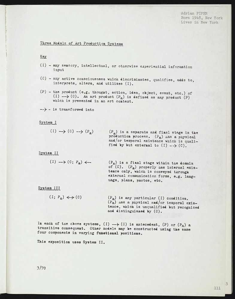 汉斯·哈克(Hans Haacke)的《投票》(Poll)和阿德里安·派珀(Adrian Piper)的《艺术生产系统的三种模型》(Three Models of Art Production System)等作品后来被归纳为“体制批判艺术” (institutional critque art) 最早的实例。派珀和哈克的作品所呈现的“信息”,勾勒出了博物馆在调解权力关系和维持不公正方面所扮演的同谋角色。哈克在《信息》中完整地公布了他的选票,而派珀使用伪代码语言在名为“艺术生产系统”的体系中对自己的艺术进行算法化。她的自我诊断为:“系统II…(Pa)仅具有内部存在,这通过外部通信形式传达,例如语言、计划、照片等……此论述使用系统II。”9同上,第111页。 与展览的形式相比,这些作品基于书本的展示方式似乎很合适——它们不受构造空间的束缚,当读者的手与书页接触时,这些作品就引起了他们的回应。投票和伪代码都模仿了社会数据的大众传播,而这样做揭穿了“信息”可以被中立传输的神话。