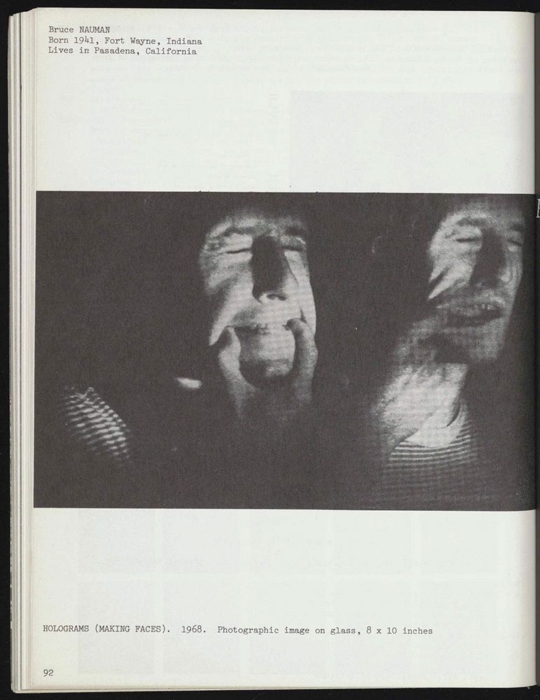 参与的艺术家们通过试验性的方法将自己的思想表达在《信息》的页面上,在这一过程中出现了一些重要的观念艺术的视觉形态。尤其值得一提的是《信息》展示了一种与报道摄影美学的广泛互动:通过类型学或序列图像来纪录行为表演和各项提案,它们模仿了身体动作和建构环境的变化。这类基于身体的行为表演包括基思·阿纳特(Keith Arnatt)的《自我埋葬》(Self-burial)和布鲁斯·瑙曼(Bruce Nauman)的《全息图(做鬼脸)》(Holograms (Making Faces))。伯恩德和希拉·贝歇尔(Bernd and Hilla Becher)的《匿名雕塑》(Anonymous Sculpture),是一座工业塔的正视图。像罗伯特·史密森(Robert Smithson)和迈克尔·海泽(Michael Heizer)这样的大地艺术先驱,可能已经在遥远偏僻的地方通过对部分地球景观的调整来实现自己雕塑(或反雕塑)的愿景,而他们给予景观的变革思考被记录下来并铭刻于《信息》的页面之间。史密森呈现的是他在罗马Cava dei Selci创作的第一件完全处于户外的装置作品的提案,而迈克尔·海泽的六幅序列性的方形图像则揭示了他后来在内华达州奥弗顿(Overton)的装置作品《双重负向》(Double Negative)的拆除工作。10参见link。