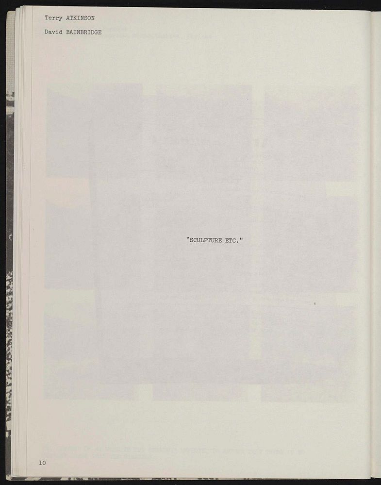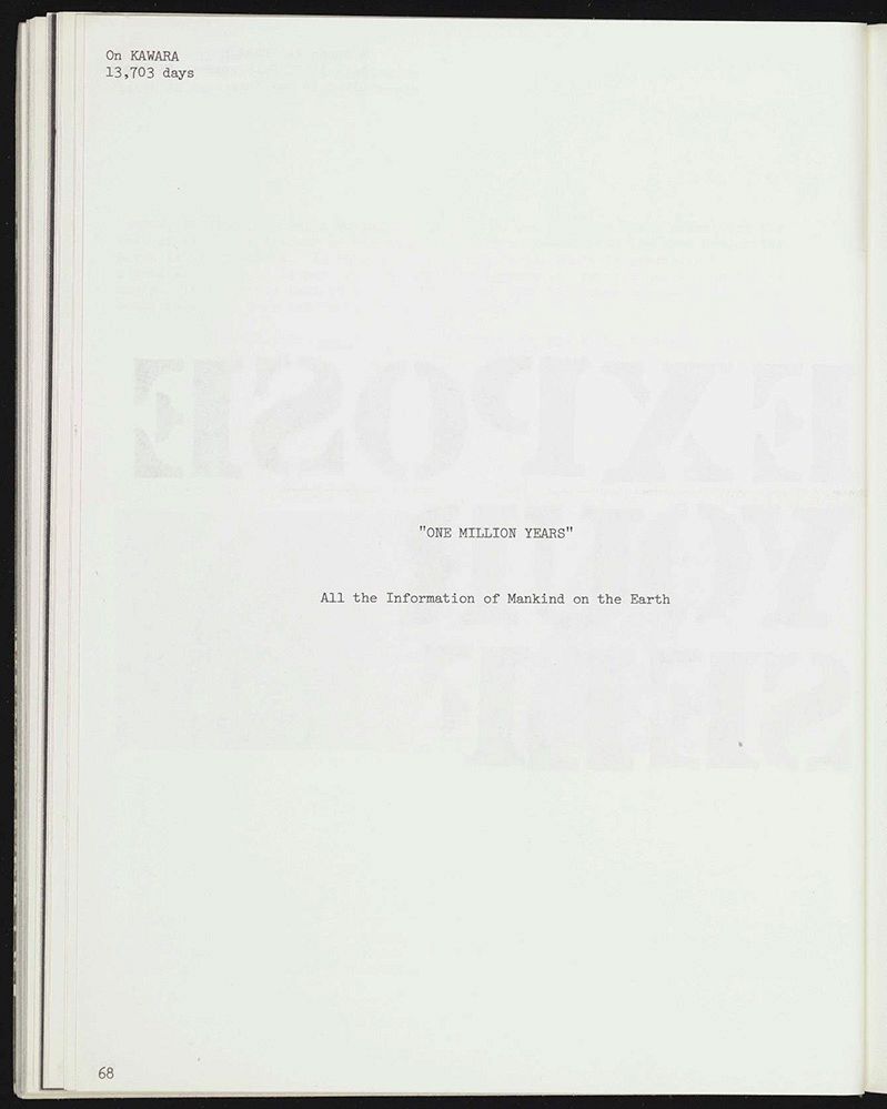 对艺术之语言本质进行观念主义的挖掘,极佳地体现在艺术语言出版社(Art-Language Press)的特里·阿特金森(Terry Atkinson)、大卫·班布里奇(David Bainbridge)和迈克尔·鲍德温(Michael Baldwin)身上。他们的作品《雕塑等》(Sculpture Etc.)仅以标准字体写成的大写英语字母来宣告作品的全部内容。这样的作品对传统的艺术时空体验感进行了无限地压缩,并直指后来被称为观念艺术的核心宗旨:用视觉形式去强调特定理念在实现的瞬间中那种并存的开始和消亡。河原温(On Kawara)分期连载的作品是一个特例,其中所使用的文本并不对作品本身基于时间的现实进行压缩,而是去无限扩张作品的时空体验。河原温在艺术家简介中没有提及他的出生时间或地点,而是通过他在世的天数来标记自己的存在。至于作品,它以自己指定的持续时间的范围来表明其全部的内容:“一百万年。人类在地球上的所有信息。”这个页面试图探讨时间的宏观和微观经验,作品似乎提出了一种假设:世上并不存在所谓的“视觉”媒介,只有表现时间的载体。再一次的,在这里,我想谈论的不仅仅是从某一本书中获得的可见性,更是从这件特定的书物中脱胎而出的一种艺术语言。