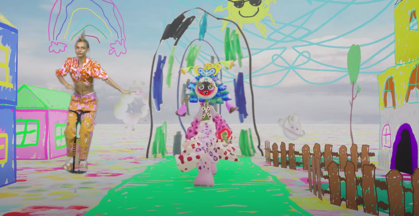 九月时,随着时装业迈入全球新冠疫情爆发以来的第一个重要周期,Collina Strada的2021春夏系列向我们展示了一种乐观主义的超现实性:在迷幻的虚拟环境中层层叠叠着模特们的低保真绿屏素材,再配合上异想天开的3D动画和艺术家肖恩-基尔·里昂斯(Sean-Kierre Lyons)开发的拟人化角色的舞蹈作为点缀。Collina Strada创造的多媒体体验不仅仅是简单的时装展示,更是设计师希拉里·泰米尔(Hillary Taymour)和长期合作者查理·英格曼(Charlie Engman)的创作结晶,它呈现出了在这个特定时刻发生于时尚文化领域中的诸多对话:因为全球性流行病、多样性、环境主义以及虚拟与触感之间的关系等因素所造成的必须的物理距离。泰米尔和英格曼创造的数字乌托邦欢迎人们将其与Happy99自身对幻想和现实的神秘化进行比较,让粉丝和消费者都能将自己沉浸在超越商品的叙事中。