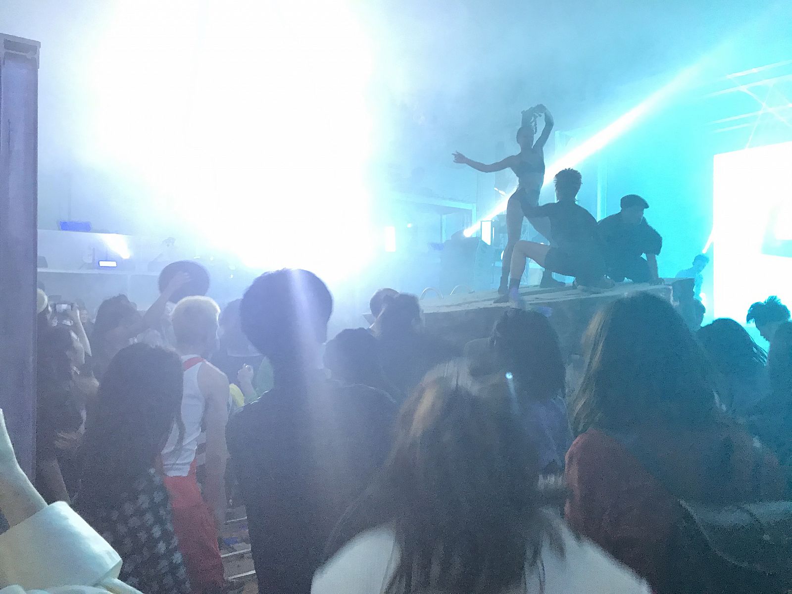 最能够说明这点的正是陈天灼在去年于北京木木美术馆798馆的个展《入迷》,艺术家占领了整个美术馆空间,进行两天各12小时的马拉松式表演。他和表演团队一起在美术馆的展厅中开创一个新世界,在两天的表演结束后,整个表演剧场的衰败背景则成为展览的装置作品。而此中的关键,正是高强度的现场表演。乐手City、Dis Fig和Ylva Falk以手上的合成器、鼓声及人声将几个小时的锐舞推向顶点。离开锐舞的摇滚区的美术馆侧翼,则是十几张天灼做俱乐部项目的群体Asian Dope Boys过往演出的海报,围绕整排音箱放着日本DJ行松阳介为12小时演出所做的音乐。展览在很多层面都可以说是天灼有意在当代艺术世界和地下俱乐部两边游走的产物。而《入迷》正说明了俱乐部现场转化视觉艺术,作为现成素材喂食给当代艺术的绝佳案例——无论是好是坏。这个声音场景中总有些抵抗的力量,不至于完全被当代艺术机构所吸收,而且为这个生态圈提供最具个人性,改变全局的创造性力量,其中的关键正是这些自信的抵抗。我相信,适度的合作会是这个声音现场的未来。