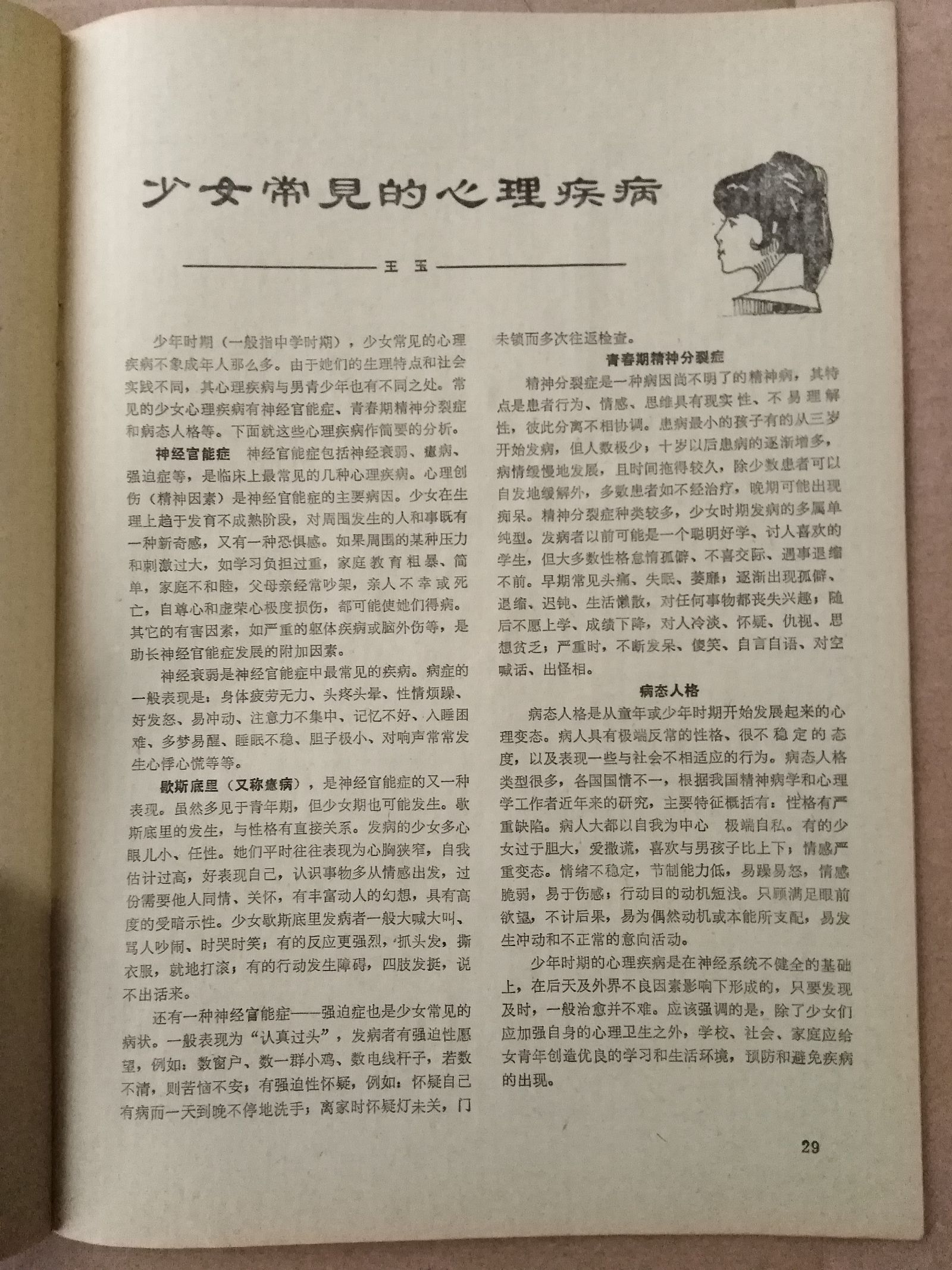 这些故事里,在爱与不爱的伤害、矜持与主动的拉扯、背叛与原谅的徘徊之间,可以看见爱情与忠诚的道德准则、自由与解放的现代精神、家庭与妥协的儒家传统在女性亦步亦趋的身体内来回地撕扯。刊末的一篇科普译文“适时”地介绍了“少女常见的心理疾病”6p29 ,涉及的病症包括神经官能症、歇斯底里、青春期精神分裂症、病态人格——在前文充满撕裂感的并置之下,这些女性的“疾病”显得再“自然”不过,她们被赋予的多重的劳动和美德(勤恳奉献、自主自立、忠于爱情且拿得起放得下)似乎天然地定义了她们的病态。