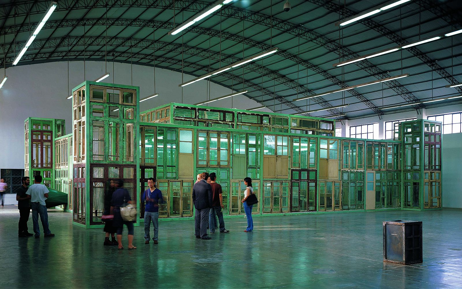 刘韡早期一点的作品《徘徊者》(2007)和《仅仅是一个错误》(2009-2011)充满幽灵和人类两种气息。这两组装置集成主要是老式木质门框窗架——可以想象它们以前都曾为一个个老式工房隔出室内和室外。随着城市高速发展的建筑拆迁,它们被分开又重组,现在看起来像是座暂停的万花筒:透明,遵循一种规律的原则叠起。它们是一个个将可能性凝结并存放起来的胶囊,其外壳划定了自身发展的界限。看着这个外壳所勾勒出的巨大内部空间,我心里感受到的内在性并非个人内在,而是公社般的那种更大的内在性。也许并不仅仅是一栋楼,而是这个城市里无数类似的楼,人们生活在类似的环境、作息和情感纽带之中。这也正是我对以前大型集体住宅的某种印象:在精神、情感和制度层面上的深层连结。