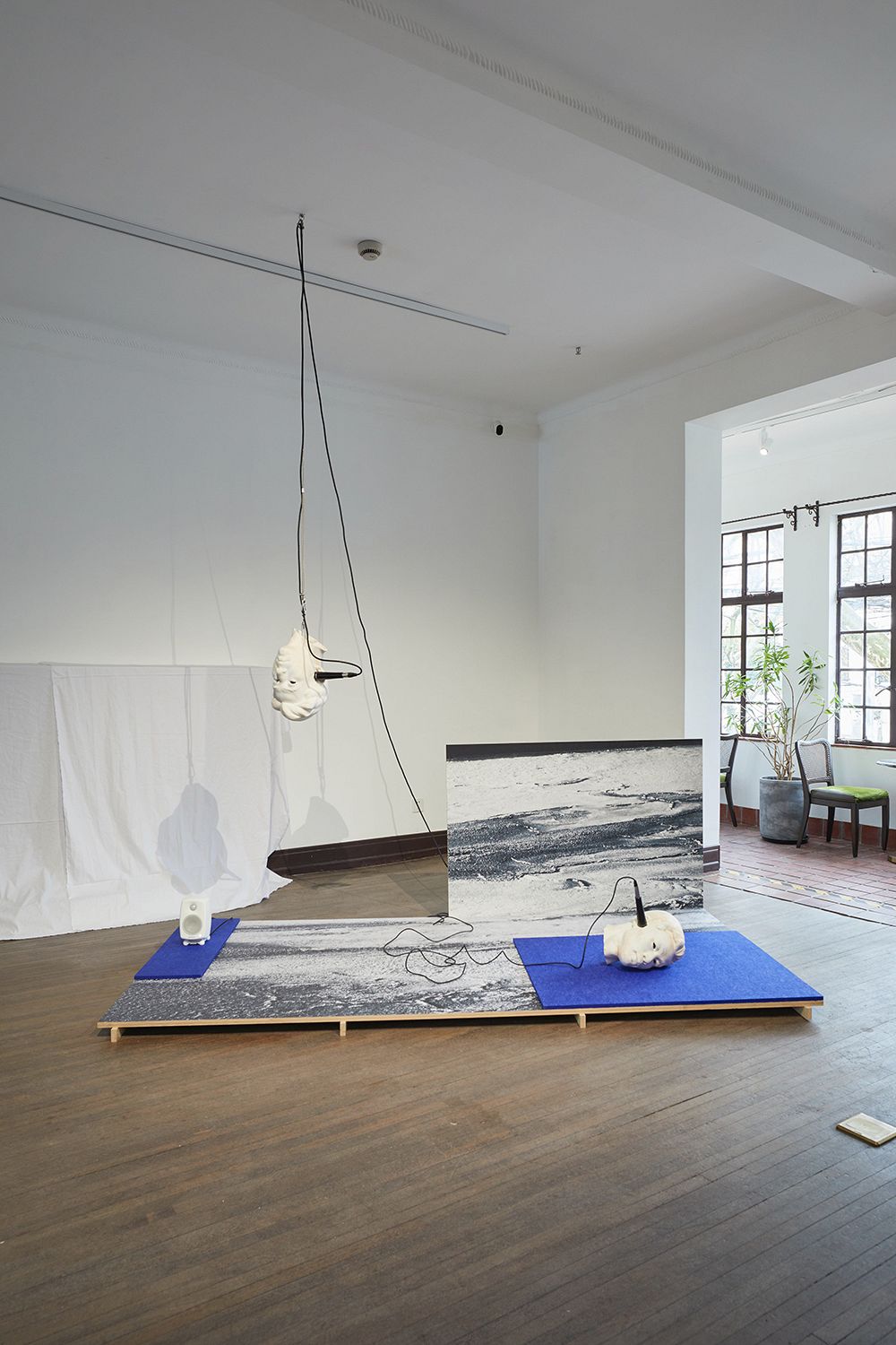 徐喆,《/.wav/》,声音反馈装置,尺寸可变,2023.“每一次沉默都是隐蔽空间”展览现场,花厅计划. 摄影:叶枫荻