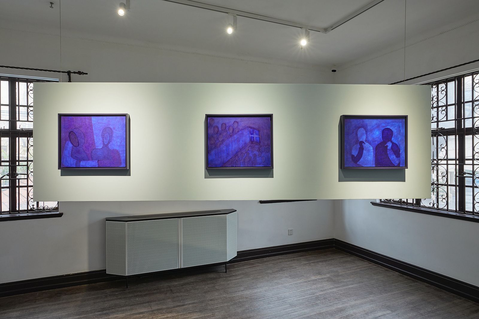 从左至右:瓦吉科·恰齐亚尼,《工人和她的影子》、《电梯里的矿工们》、《工人和他的影子》,纸上马克笔,29.5×36.8cm,2023. “每一次沉默都是隐蔽空间”展览现场,花厅计划. 摄影:叶枫荻