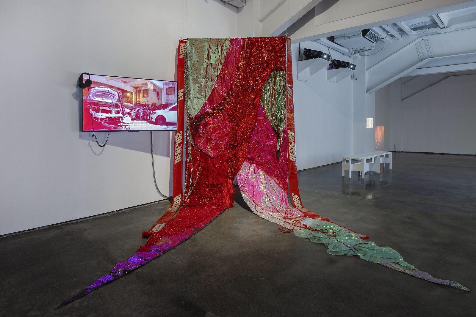 黑曼巴,《展(怪)物:三件作品的空间实践》,2021,海报,旗帜,影像。“铁克诺世界”展览现场,MACA,2025。摄影:杨灏