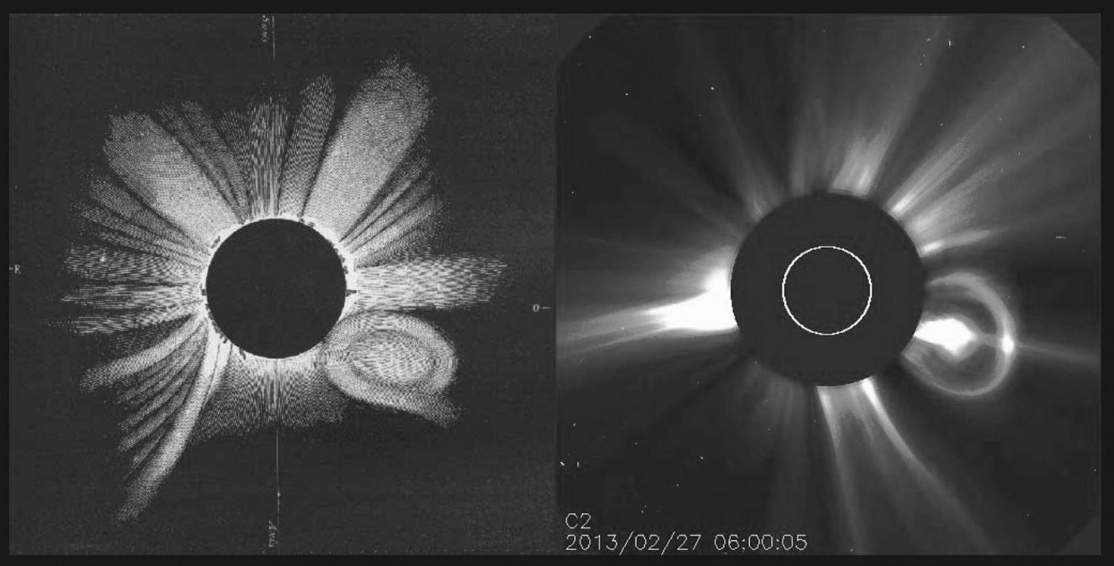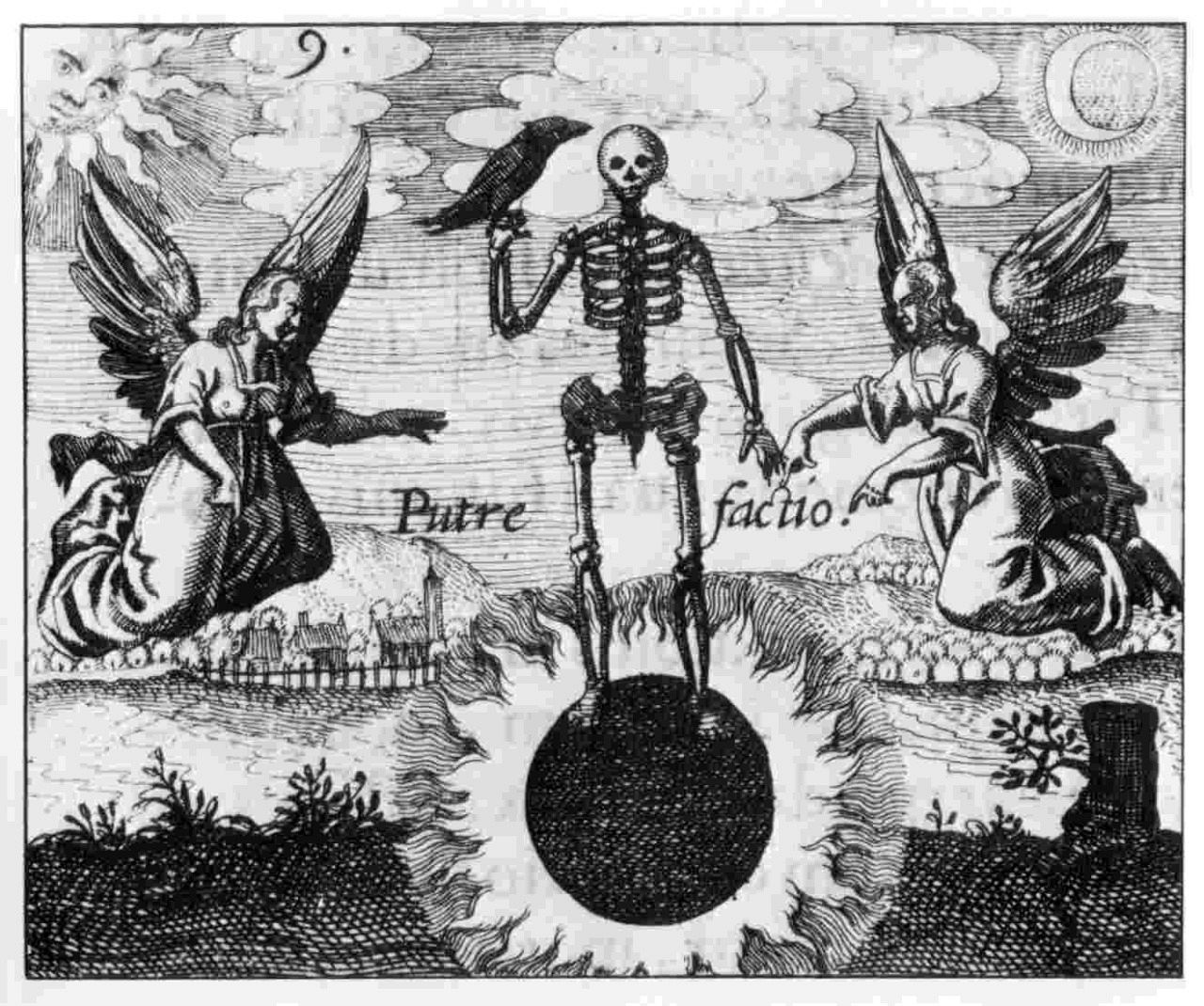 During a total solar eclipse, coronal mass ejection can be seen with the simplest optical devices. In the summer of 1860, a year after the Carrington Event, an astronomer in Spain hand-traced the unusual swirly structure he saw during a total solar eclipse. In alchemical symbolism, the eclipse motif of sol niger, or “black sun,” recurs often. It refers to nigredo, the “blackening” or putrefaction, which is the first step in the alchemical “magnum opus,” the creation of the philosopher’s stone. After nigredo, the alchemical starting material then undergoes albedo (whitening), citrinitas (yellowing), and rubedo (reddening), before the legendary philosopher’s stone, something capable of turning base metal into gold, comes into being. Carl Jung rediscovered the principles of alchemy as archetypes to his own psychological concepts. For him, sol niger stands for the dark and chaotic aspect of consciousness, the hidden destructive side of the sun god – after all, Apollo is revered as the god of healing, but he also spreads deadly plague with his arrows. Nigredo is the time of despair and disillusionment, of the subject coming to know its shadowy counterpart, the time when id and superego are at daggers drawn. The painful process of individuation. Nigredo, the blackening.