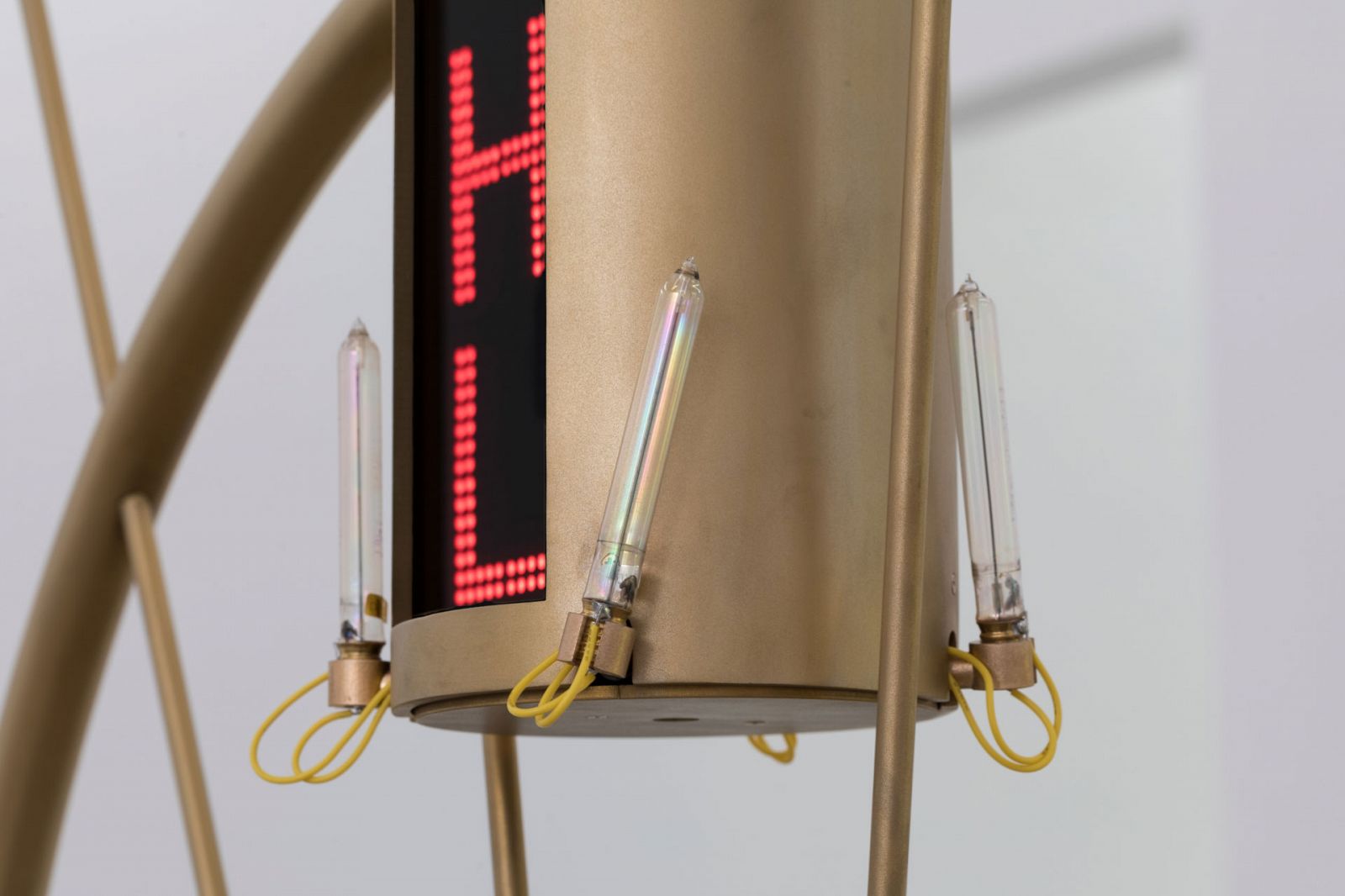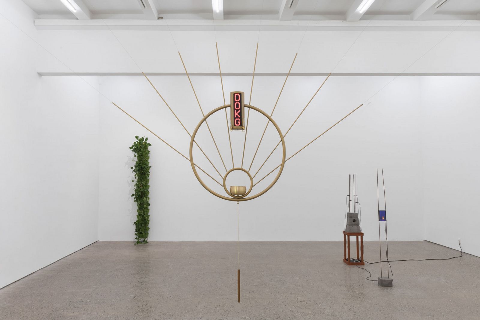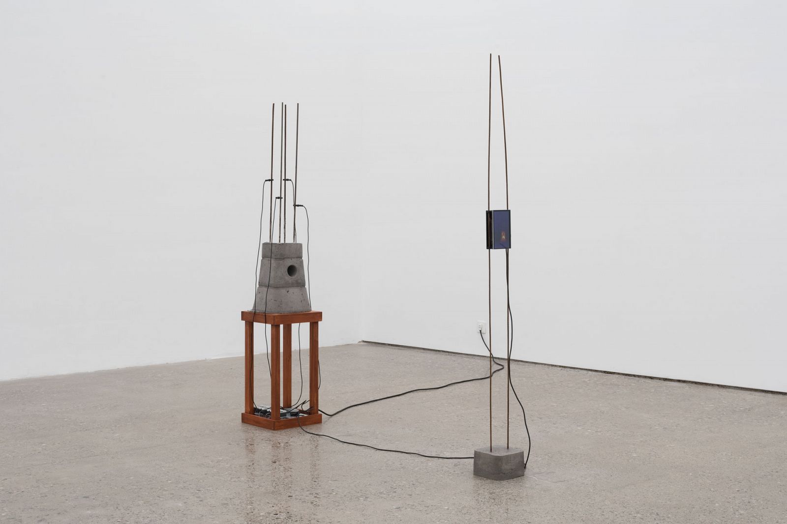 Perhaps precisely because of such powerlessness, Guo Cheng is forced to adopt an attitude of near meaninglessness when engaging with such objects. All of the artworks on display by Guo Cheng give off a small, calm quality, of extreme emotional restraint and conscious distance. All of the objects that play major roles in the space, whether the trembling Geiger–Müller tubes and infrared cameras of The (Temporary) Gadget No. 5 or the intermittent and unidentified crackling sounds from Amber, all hunt for signals outside of the human spectrum; for example, the background radiation remaining from thousands of nuclear tests. In The (Temporary) Gadget No. 5, tentacle-like Geiger-Müller tubes protrude from devil’s ivy and cacti, bearing a striking similarity to the psychics in “A Room with a Voice” who are obsessed with video recording technology (why does a psychic need a video cassette?). Technological apparatuses (Geiger-Müller tubes “detect radiation”) and folk religious beliefs (devil’s ivy “wards off radiation”) seem to coexist tenuously. When the prerogative to “detect” is given to these small instruments, the humans who walk between often feel a mild unease: the objects in the gallery space are obviously human-made, even handmade, yet the sharp, dry and alienated atmosphere they create has nothing to do with humanity. The objects we create with our hands seem more interested in a hidden nature, composed of invisible signals. Amber No. 8 carelessly detects heated a circuit, buried within concrete, as well as the infrared radiation emitted by passing human bodies, without giving any actual temperature readings. Everything in the gallery seems only to detect, never to respond. This is not, however, a desolate, cruel space filled with dead things, in which humans have been judged and gone extinct, but one that preserves a certain liveliness, cleverness, witchiness, as if ruled by assemblages of things that have inherited human traits.