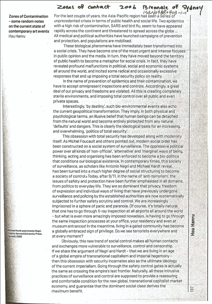 History never repeats itself. But sometimes, there are exceptions: after 15 years, again, we are now back to facing a new SARS, named COVID-19 this time, in a much more global scale. And we are confined at home… One of the few things that are “good” for us in this lockdown is to have the time to open old files on our computers. And I have “rediscovered” this old text, published in the catalog of Sydney Biennale 2006 (“Zone of Contact”). And I feel it still relevant… because it reminds us of some unsolved problems; and this time, they appear to be more urgent, but also more difficult to solve… So I propose to share it (in a slightly reduced and edited version) with the readers of Heichi (whose name I love: Black Teeth!).