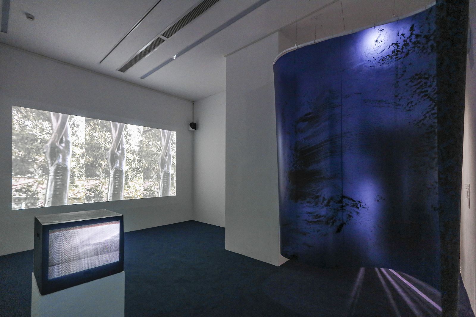 The interest in duration—and a protracted sense of temporality—is shared with Su Yu Hsin’s complex audio-visual project Hibernatemode (2019). The scope of Su’s work is prodigious. Fragments of scientific text, philosophical exposition, and research-laden video segments interweave the viewer into a network of relationships linking the microscopic world of the mosses to a planetary scale of biology, geography, human beings, and technology. Its expansiveness is referenced through the speculative depth of Aion time, a concept that points both to the Hellenistic deity of eternity, the seasons, breath, sleep, and dreams, and to the expanded experiences of time in the medium of film. Though formally aligning with the research-based video practices that have proliferated in the past years, Su’s work comes to us less as an argument than a speculative action field. With perceptual cues coming from two screens and six sonic channels, this asynchronous audiovisual constellation pushes the link between our cognitive and sensorial modes of comprehension. Frames of references are constantly shifting, and we are as much haunted by the expansive control of Google Earth as the animist whispers of nature: “progress is drawing other kinds of time into its rhythms”; “air carries data”; “water carries memory”; “Z-axis”; “superpositions of the now.”