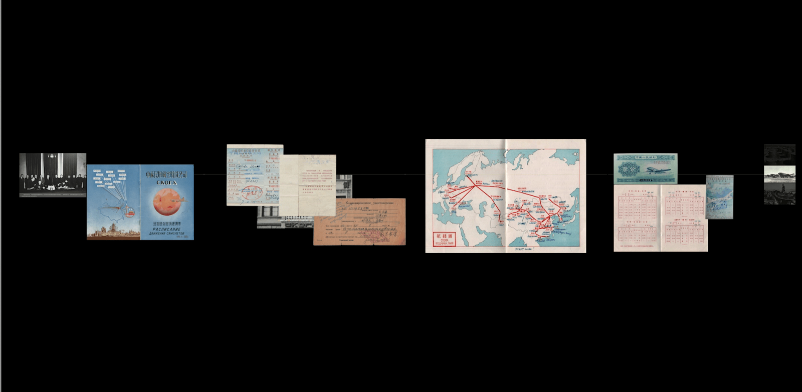 Equally research-laden, but more in the form of a participatory documentary is Zheng Yuan’s three-channel video installation The Last Step of Touch Down(2020). For this hour-long piece, documentary footage of national leaders, ambassadors, and visiting delegations stepping out of airplanes propelled the artist’s investigation into the history of imported aerial and media technologies during Cold War-era China. The three laterally flared-out HD screens form a half-circumscribed viewing experience. On these screens, sequences of personal narratives, direct interviews, and personal photographs braid with recently declassified government files, maps, and television news footage. Representational strategies that are typically used to build a sense of the documentary’s subject—such as the delineation of perspective and character—open up to new frames of reference. We are unsure who is the “I” speaking at the beginning of this extensive project, the “I” that asks, via his research, about how the technologies of commercial aviation and broadcasting television came to the People’s Republic of China; how they impacted the people who learned to use them; and how these individual stories linked to a collective one, a generational one.