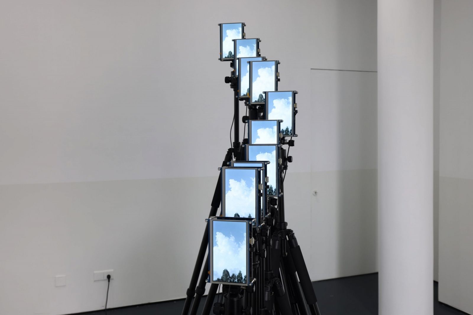 Greeting us at the entrance of the exhibition are three installations from the Hangzhou-based artist Liu Guoqiang’s Reference and Graphic Dimensions series. In each of these works, the abstract concept of the “edge” takes on and then evades, concrete form: the edge of time, the frame of an image, or the border that separates material technology from the finished product. Reference #1(2020) is a ten-screen video installation that captures large clouds drifting slowly through the sky on a sunny day. The subtle changes in the cloud’s shapes are referenced through the layered screens, each playing a different moment of the video. If the slowness of the video invites an experience of time as continuous and expansive, the serial structure of the tripods, screens, and their exposed mechanical “base” dissect this apparent continuity into discretely framed referential units. Technologically informed frames of reference act both as metrics for understanding how we pace the rhythms of time and a formal foil to the idle activity of watching time passing.
