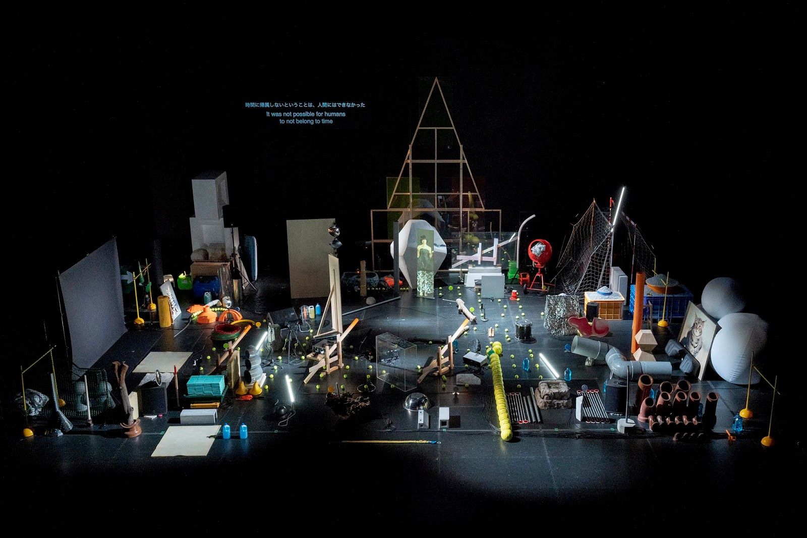 Looking back, that was a poorly written understatement that failed to comprehend the essence of Okada’s artistic intervention and the scope of the work. Divided into three parts, the performance was a complicated post-dramatic presentation of post-Fukushima Japanese society. John K. Gillespie’s review better seizes the details and the totality of the performance. He notes that “the stage rubble is concrete proxy for the post-earthquake/tsunami destruction, certainly, but also for the rubble left by Japan ensnared in the sticky throes of an extremely consumptive capitalism.”1John K. Gillespie, “What Next.” March 17, 2020, link. The theme of Fukushima has dominated, without question, Okada’s more recent works, including Current Location (2012), Ground and Floor (2013), and Time’s Journey Through a Room (2016). The rubble Gillespie mentions was part of a complex composition that “includes human stories, non-human forms, video projections, lighting and soundscapes, and a vast and impressive colony of objects,” spreading all over the stage and carefully arranged by Okada and his collaborator, sculptor Kaneuji Teppei.2Peter Eckersall, “Toshiki Okada’s Ecological Theatre,” PAJ: A Journal of Performance and Art 43, no. 1 (2021): 109. As a continuation of Okada’s response to both the nuclear meltdown in 2011 and the mountains effaced by the city of Rikuzentakata’s reconstruction project to raise the shoreline, Eraser Mountain aims to create a theatre where the relationships between human and nonhuman are rethought and interrogated.3“chelfitsch & Teppei Kaneuji ‘Eraser Mountain,’” chelfitsch, accessed March 13, 2021, link. During the performance, six actors moved the objects around, but none of their movements had any logical meanings matching their already nonsequitur narrations. The objects seemed to gain autonomy, stripping away any human controls over the space and eliminating the possibility of returning to order.