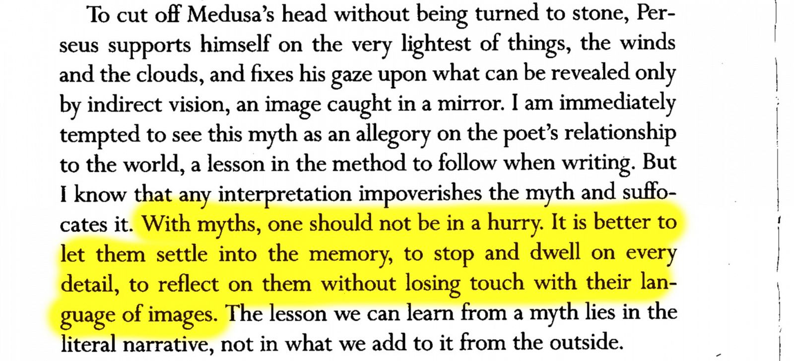 卡尔维诺将作家与世界的关系定位于珀尔修斯和美杜莎的冲突之中,我在此所看到的,是艺评人、策展人与艺术家作品之间的关系也十分类似。在这两种情形中,冲突都通过“我们能从神话故事中吸取什么教训”来得到解决,而这些“本就存在于文学叙述之内,并不是我们从外部对其做出的添加。”